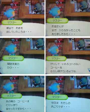 続はとの巣にて 今日は更に、いろいろな話をしてくれたマスターでした いろいろと、辛い過去もあったようですね・・・ おお?!おごりかぁ~?!と思ったけど、『既に、お金もらっていますから・・・』で終わっちゃいました。さすが、マスター・・・ 商売上手だ・・・。 ♥ More from my site2007-05-07 ショック!2007-04-06 今日もおい森だよ2007-04-08 アンヌのお誕生日2006-11-21 なんで、黙って・・・ By mariottie | 2006-06-12 | 森の住人達 | ← 仲良くなってきて 3回続けて → 2 thoughts on “続はとの巣にて” AKRMA 2006-06-13 at 00:04 ですよね・・w 一度は通る道?!(爆 でも、あんなにぶっきらぼうだったマスターが いろんあ話をしてくれるようになって なんだかリアルで嬉しいマリオッティちゃんでしたw 会話を追うと、噴出しちゃう場面が多いのは確かね♪ あずき 2006-06-12 at 19:19 マスターの過去話しね♪ 私も前に聞いたわ マスターとフータとの関わり合いも楽しいし^^ 住人たちのドラマイベントってホント((o(^∇^)o))わくわくしちゃいますよね