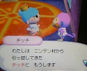 ニンテン村から ステーションのすれ違い通信をしたのが、昨日。丁度セルバンテスが荷造りをしていたので、お引越しかなと思っていたら・・・。 セルバンテスの手紙がポストに…。 そして、Xボタンで見たら・・・チッチが来てる!! すれちがい通信で、ニンテン村から来たようです。 お友達のあずちゃんの村で、一足先にこの情報は得ていたのですが、半信半疑だったので(本当にに全員にくるのかな?って)すごく嬉しいですw ええ、もちろんこの子は永住決定ですね♪ ♥ More from my site2007-05-07 ショック!2007-04-06 今日もおい森だよ2007-04-08 アンヌのお誕生日2007-01-06 最近のカサブランカ村 By mariottie | 2006-07-12 | 森の住人達 | ← やっとです。 ローランから → 11 thoughts on “ニンテン村から” AKRMA 2006-07-14 at 21:24 >苺さん 写真・・・絶対ゲットしましょう~♪ 苺 2006-07-14 at 18:13 >AKRへ さるお、見た目僕系だと思ってました^^; でも、おいら系なんですよね…;ともかく写真を貰いたいんですよね、カワイイからっ。 >あずきさん さる系ってほとんどカワイイですよね♪ 1年間ぐらいずぅっと居てほしいなぁ…。 AKRMA 2006-07-14 at 16:27 >苺さん (・◇・)ゞリョウカイッです! 友達コード登録しておきますね。 さるおが来たんでですね♪さるおも可愛い! さる村もいいなぁ・・・なんてw 毎日音楽変えてなくて<( ̄∇ ̄)ゞゴメン・・。 苺 2006-07-13 at 22:03 AKRっ、そうだったの???初めて知ったよ。 私の村に『さるお』が来ました。嬉しい~♪カワイイ~♪ まぁ、♂なんだけど・・・^^ 今日も仕立て屋の音楽ですよね??? AKR、コード貰いました~★早速登録して下さい。 マリオッティを登録すれば良いんですよね? 友達コード・4338-6604-9725 名前・いちご 村名・(ハート)AKM(ハート)村 (ハート)は記号のハートですよっ! AKRMA 2006-07-13 at 01:00 >あずきちゃん そうなの!!やっぱり情報は正しかったわヾ(〃^∇^)ノわぁい♪ ニンテン村っていうのがいいですよね!! 引越しは知らなかったのに、ここまで固執したのだから、 知ってたらもっともっと早く通信してたと思います(爆 さる系は可愛いですね!さるおにも会いたいわ☆彡 >苺さん こんばんわ!へ~家のお隣にあるなんて、なんて便利(笑) だから、ステーションでのwi-fi通信が可能だったのね! 納得しちゃいました(⌒^⌒)b 音楽は当たりです~! >ダーマ母さん (^▽^* Ξ *^▽^) イエイエ♪ 一回目は、最初から、ボトルを購入して、流しておいてから、 ステーションの前で すれちがい通信をする方が、てっとり早いですよ。。 ステーションの前でDS片手に必死になっていた私としては、 そうすれば良かったと 段取りの悪さにちょっと、こっぱずかしかったので(苦笑 でも、2回目はそこでやるしかないので、頑張ってください! 『さるお』か、『チッチ』のどちらかが次の日に来るそうです~w 乞うご期待!! ダーマ母 2006-07-12 at 23:23 ありがとうございます♪ すれ違い通信にしてステーションのあるお店に行けば良いのですね? 苺 2006-07-12 at 20:20 AKR久しぶりです♪♪ 私はいつでも行けるんだな☆ミ だって、家の隣にあるんですから~。(本当) 今日からこのHPのミュージックを当てたいと思ってます! コメント欄に書くので、正解or不正解を言って下さい。 今日のミュージック★仕立て屋のミュージック あずき 2006-07-12 at 20:18 キャーq(≧∇≦*)(*≧∇≦)pキャー チッチじゃないですか~♪ いいなぁ~さるおも可愛いけどチッチもとっても可愛い なんと言ってもピンク系だから(*≧з≦)す(*≧д≦)き(*≧o≦)よ(*ノ∀ノ)キャ♪ やはりレアキャラは永住組決定よね(*^-^)/\(^-^*)ナカマ! AKRMA 2006-07-12 at 19:00 あらら、直接のページは見れないみたいです(^^;) なので、トップページのDSステーションからどうぞw http://www.nintendo.co.jp/ds/index.html AKRMA 2006-07-12 at 18:57 うんうん、行ける距離ならば是非ど~ぞ♪ 私も引越しがあるなんて知らなかったので、ラッキーですw えっと、『スター』とドカンは7/19まで、20からはまた、違うアイテムみたいです~。 <a href="http://www.nintendo.co.jp/ds/ds_station/index.html">こちら</a>から、どうぞ! ダーマ母 2006-07-12 at 15:26 ステーション、行ってみた~い! (近くに無いことも無い) ドカンと☆の他にお引越しまであるんですね♪ 今から行ってこようかなぁ。。。 あ、でも家の前でやってる工事のトラックに退いてもらわないと 車が出られない~;; いつまでやってるんですか?