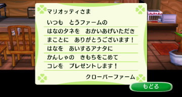 クローバーファーム 村の環境を良くする為、毎日せっせとお花の種を買い続けて、はや28日! 先ほど、こんな手紙にプレゼントが付いて送られて来ました。 付いてきたのは、銀のジョーロ!昨晩リセット監視センターにて、銀のスコップを手に入れたばかりなのに、連夜嬉しいことが続きました。そこで、早速、家の前の赤カブにお水をあげました。 お部屋にて記念撮影です!キラキラ光るのは、金でなくても嬉しいマリオッティでした 銀シリーズということで、色合いも似ている・・・w ♥ More from my site2009-05-06 色々コンプには程遠く2009-01-30 吃驚な展開で!2009-01-19 銀のオノ!2008-12-19 銀スコップの効果 By マティ | 2008-12-18 | 道具 | ← オーロラ美しすぎて シャンクすの前で → 2 thoughts on “クローバーファーム” AKRMA→さとさん 2008-12-18 at 20:01 えええ!そんなことを言ってくれていたの?! すごい感激です!!そして、いま、マンUが点決めた! (関係ないですね(汗)) でも、違う村の詳細な状況が分かるなんて、すごいコネクションですね(笑 区画整理、本当に面倒だから、時間がないとね・・・^^; 忙しい時はやめましょう[絵文字:v-274] さと 2008-12-18 at 19:32 銀のジョウロ、おめでとう。 うちの村のたいへいたが、 『カサブランカ村はすげーらしいぞ。きれいに整備されていて。こんど偵察に行ってこい』って言われちゃいましたよw うちも何とか最高にしたいんですが、区画整理がめんどくさくって・・・w