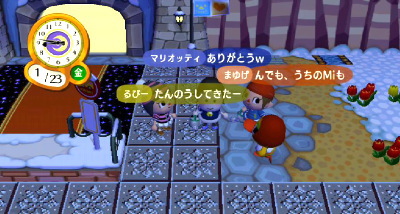Miiの話や、デザインの話など、いろいろ会話もはずみ、まゆげさんは、褒め攻撃に照れまくっておりましたが(笑、るびーちゃんも目出度く友達登録をお互いに終え、思いがけず楽しい一時になりました。まゆげさんの水路を頑張って作った甲斐もありましたね(笑