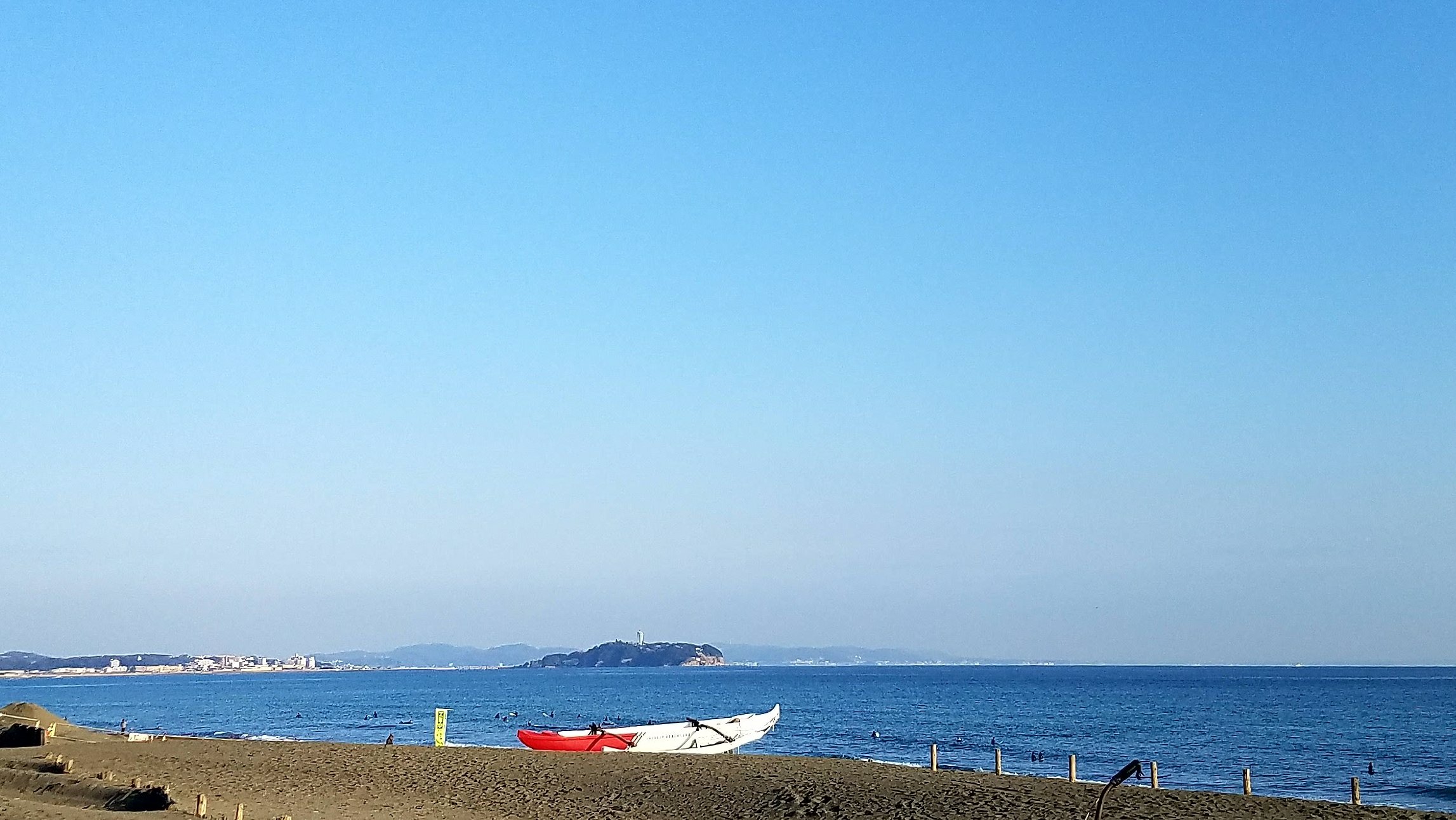 江の島もきれいに見えて、サーファーがたくさん波に身を任せていました。穏やかだったのですがね笑