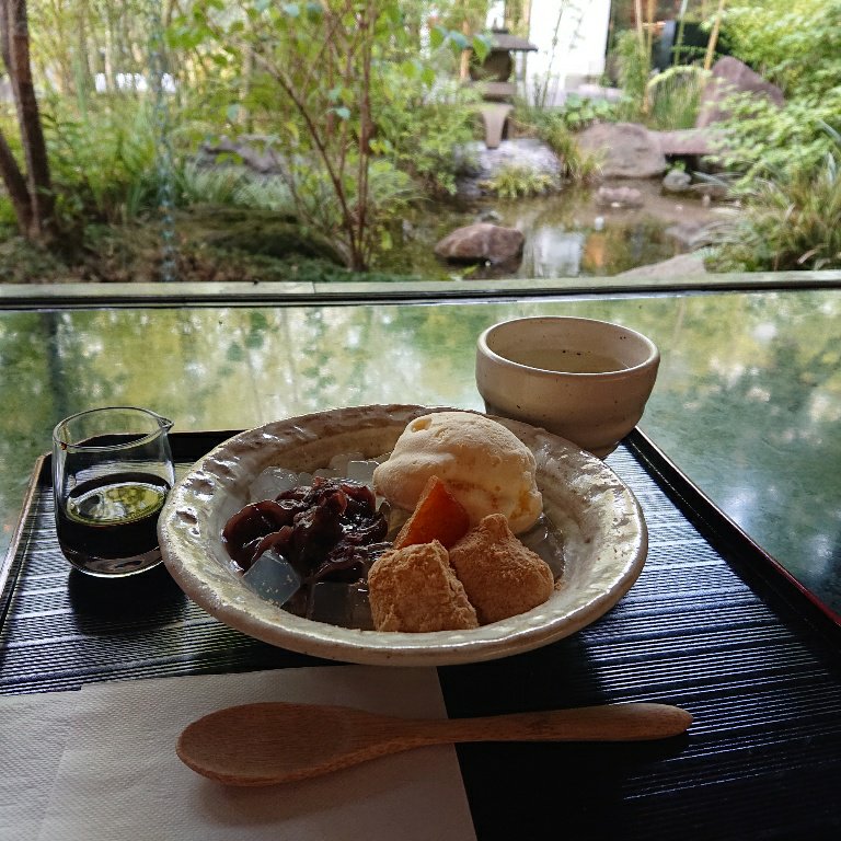 信玄餅付き~であんこも美味しかったですよ。現在はニューヨークで活躍している甲府出身の芸術家、佐藤正明氏の作品の常設展が行われていていて、前には和風な庭園がありくつろげました。