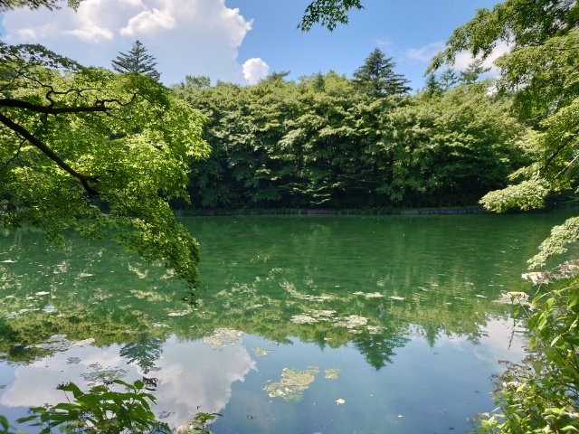 池に移る空や木々がとても美しく、紅葉の季節はそれはまた素晴らしい景色になるのでしょうね。鏡に写したかのようです。