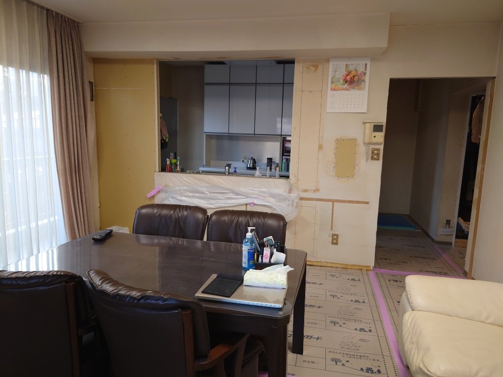これも、リフォーム入った後の写真なのでその前に取っておけば良かった・・・。カウンターが外されていて左窓側の壁は新たに設定したものです。もともと給水管工事がきっかけのリフォームだったのですが、でかい食器棚のおかげで冷蔵庫を動かさないわけにいかなくなったので。