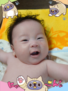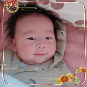 お正月バージョン。今はまだ、顔が変わるから顔出し中ですが、もう少ししたら加工画像になりますね(笑)。それにしても、2か月でこんなに笑う表情が出てましたっけ?3か月くらいからと思っていたので色々早いな~という感想です。