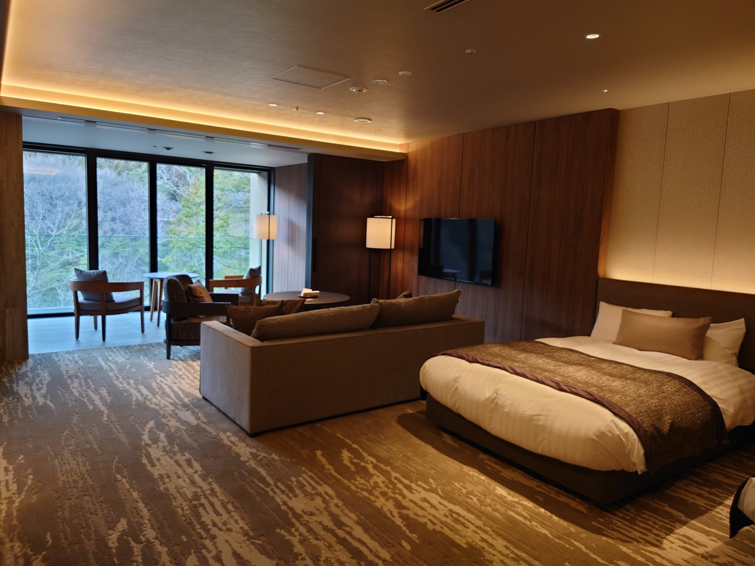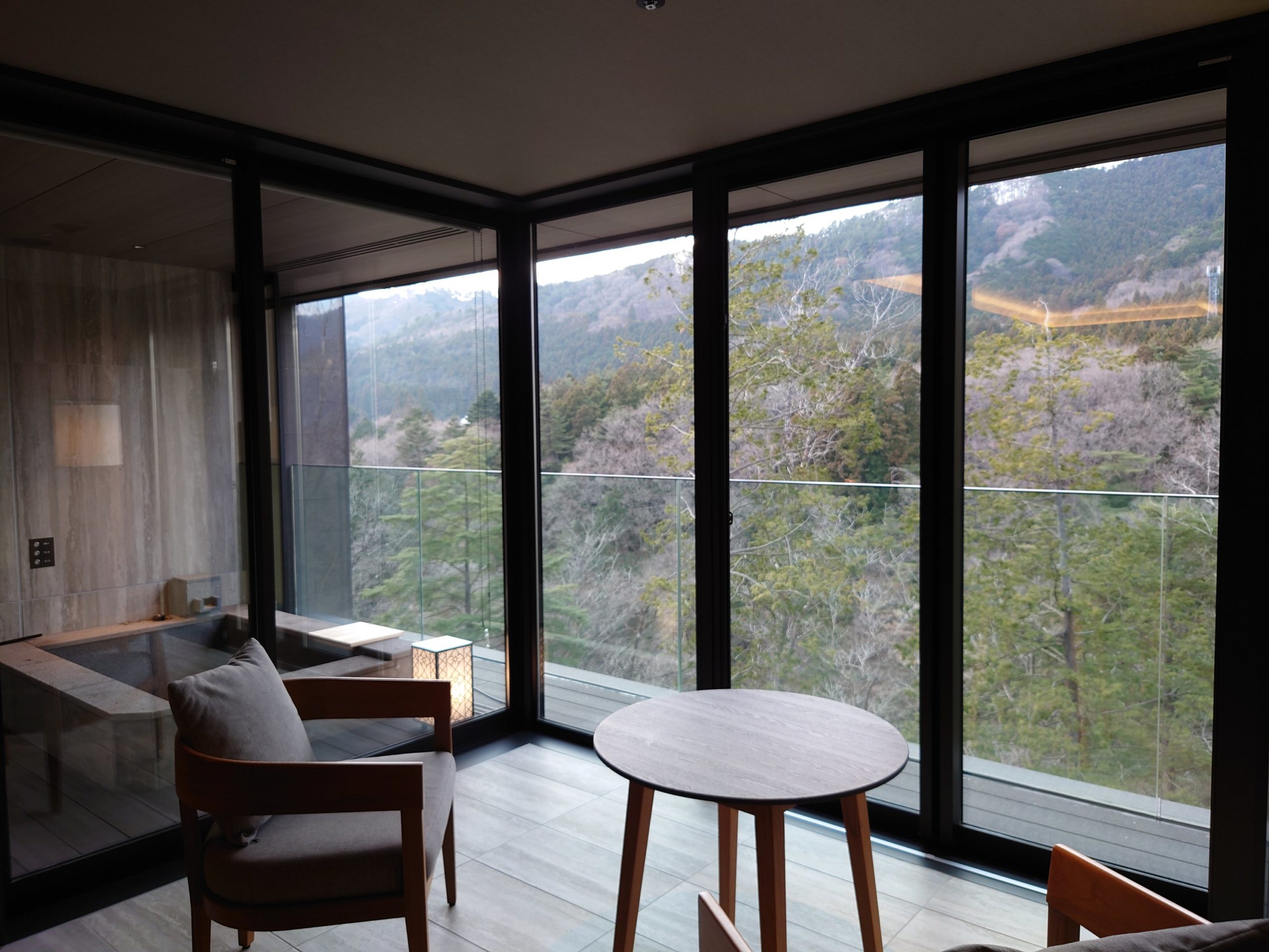 前回とは違うタイプで、開放感のあるお部屋です。ベランダはないですが、サンルームで冬はこちらのタイプがいいですね。露天風呂が丸見えですが、一応ロールカーテンがありました。