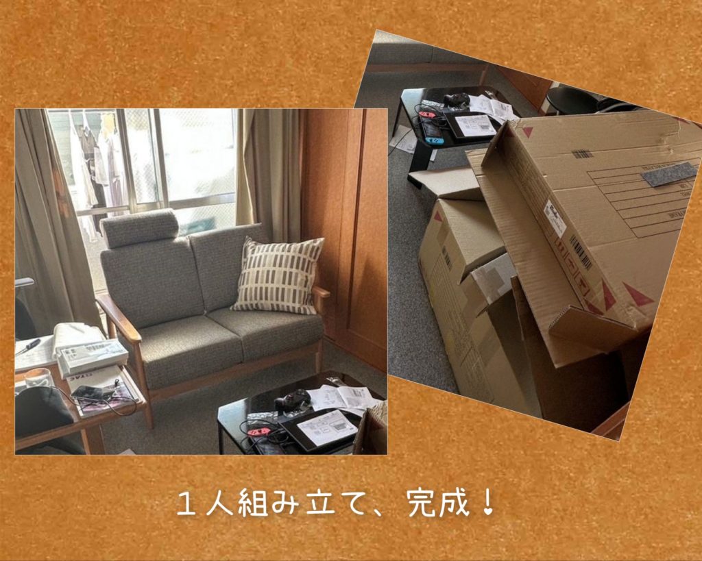 先週の土曜日にソファーを購入した次男ですが、届いたようです。完成形の写真を送ってきましたが、昼過ぎにラインが来て一人じゃ無理だから寄ってと!