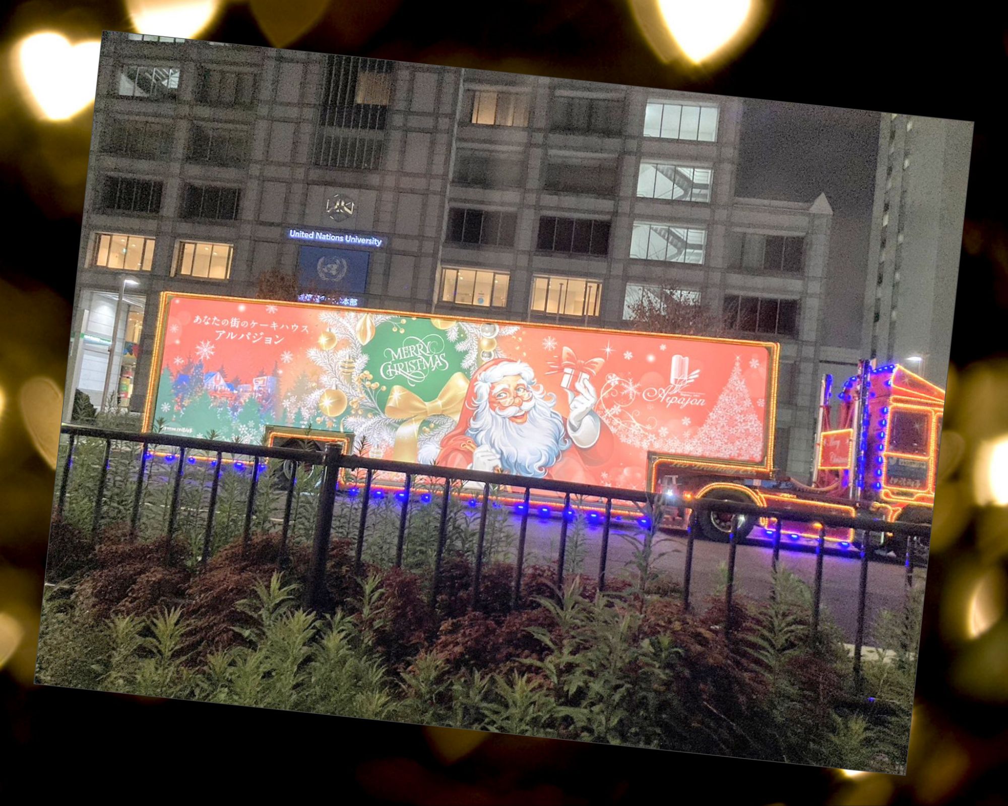 夕方から娘とまごちんを車で迎えに行ったのですが、その帰り19時頃かな~、青学の前でこんなトレラーが停まっていて、それも煌びやかなのがその後にも一台。