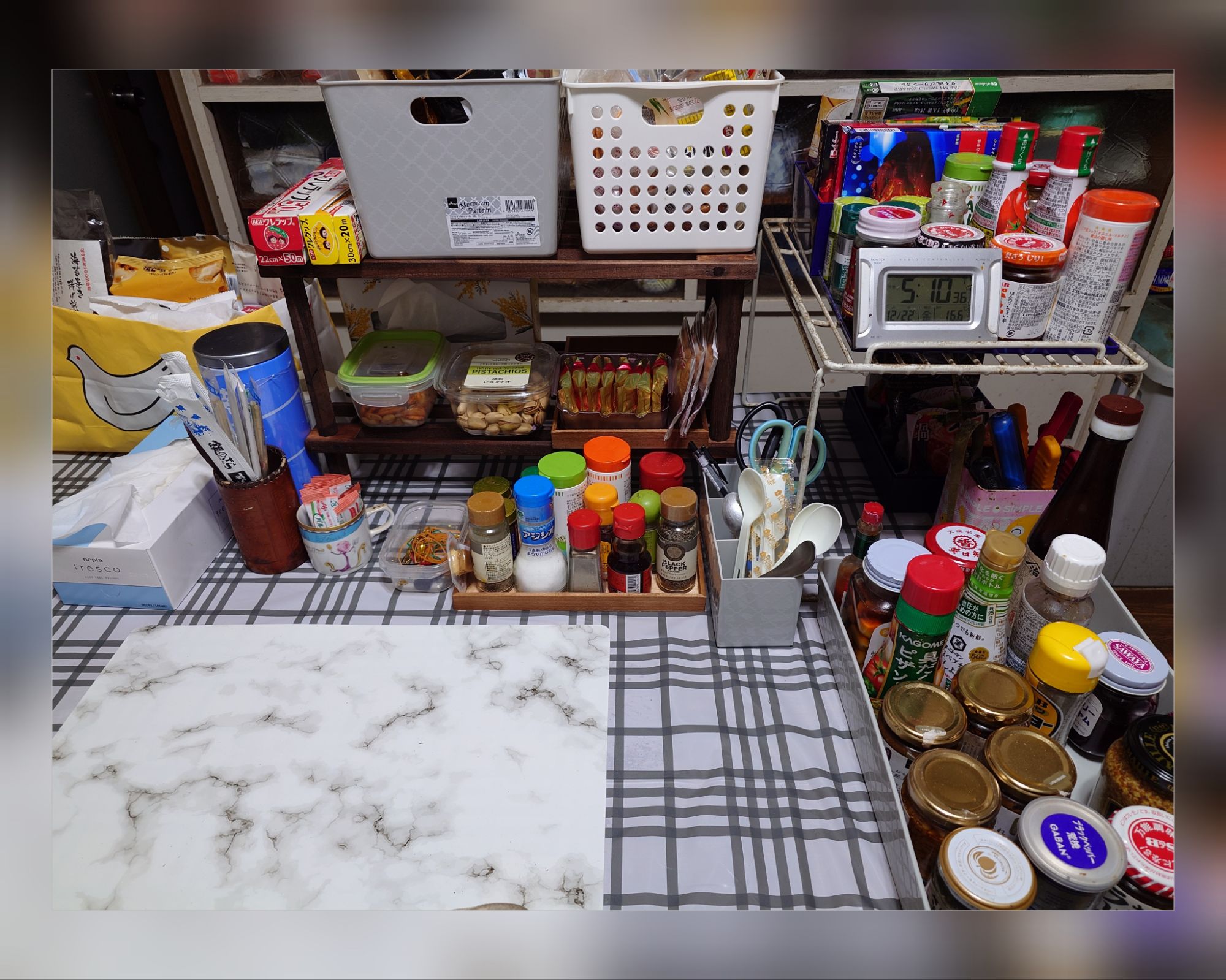 その後ひたすらキッチンのお掃除。机の上は100均グッズのお陰で何とか使いやすくなりました。