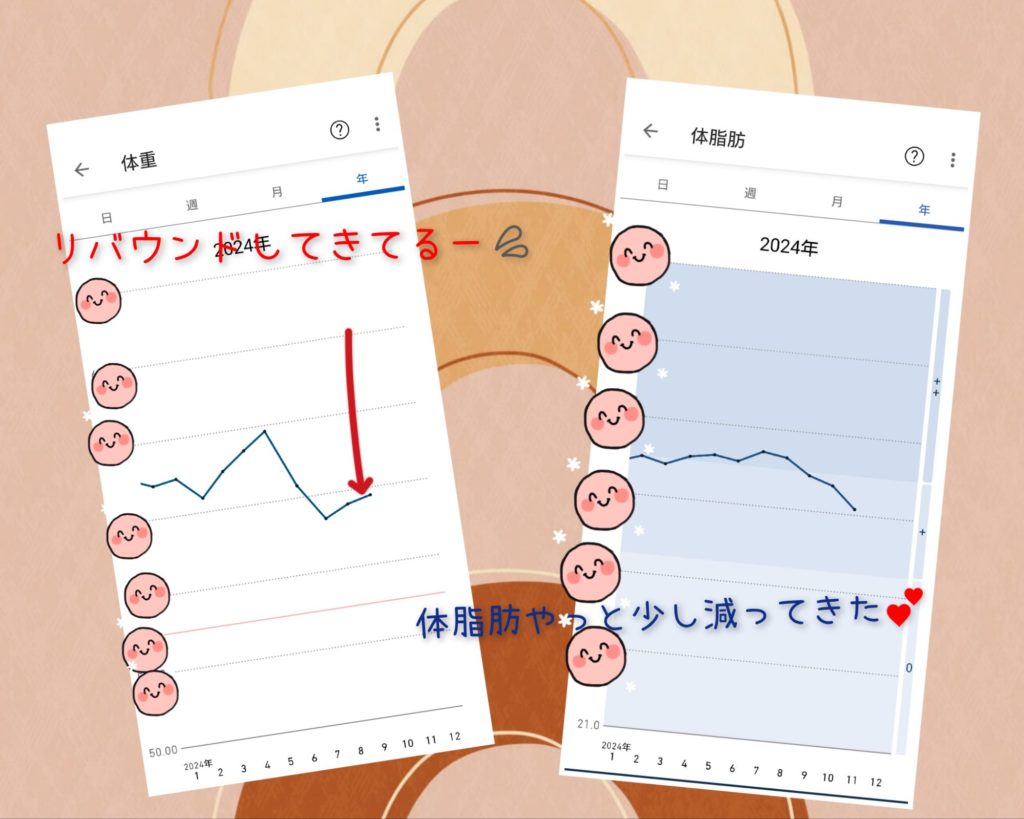 体重はリバウンドし始めていますが、それでもそこまで増えておらず、それより体脂肪がようやく少しずつ減り始めたのは良かったかな。