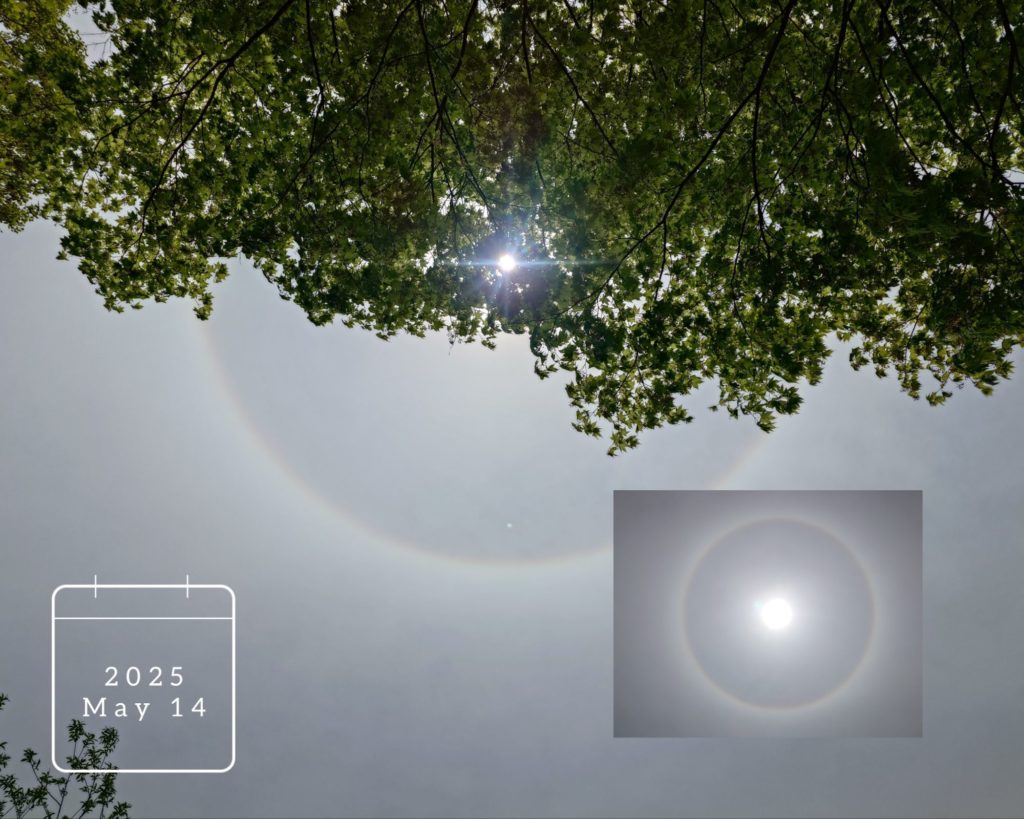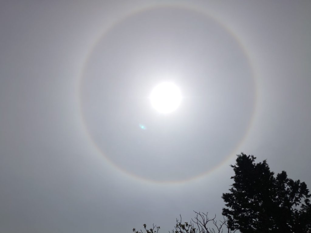「ハロ」は、上空の高いところに太陽が透けて見えるくらいの薄い雲が広がっているときに、太陽の周りにボンヤリと見えるリング状の明るい部分のことを指します。 暈(かさ)や日暈(ひがさ)とも呼ばれる虹色現象です。 通常の虹とは違い、上空の薄雲を構成する氷の粒によって太陽光が内側に曲げられ、光の強い部分が環状に見られます。