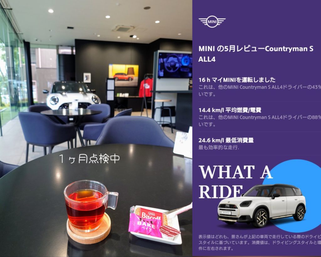 1か月点検 ミニの点検日でした。 1時間ほどかかりましたが、広い店内でゆっくりできたし、点検の結果も問題なく終わりました。 右側のアプリのビューですが、これも月ごとに送られてくるようです。今回は軽井沢に行ってきたので内容を褒められました(笑) 実は、6月もこの待ち時間に友達と急遽軽井沢旅行計画が進んで、半ばに行ってこようと思っています。薔薇のリベンジ兼ねて😊 By matiy38 | 2025-05-30 | 私のこと | ← 神楽坂へGo BLOGの契約更新で →