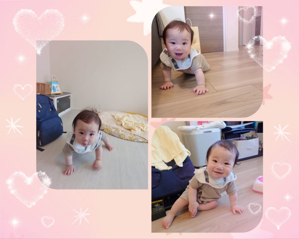 A君はハイハイするようになった話は聞いてましたが、お座りもしそうな速さ!!大きいし、重たいし、体がしっかりしているからなのでしょうね。