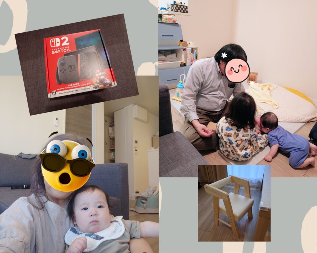 引っ越しの時、新しく組み立てたテーブルが高くなってしまったので、子供椅子が低すぎて段ボールを乗せて対応していましたが、新しい椅子も買ったようです👍✨