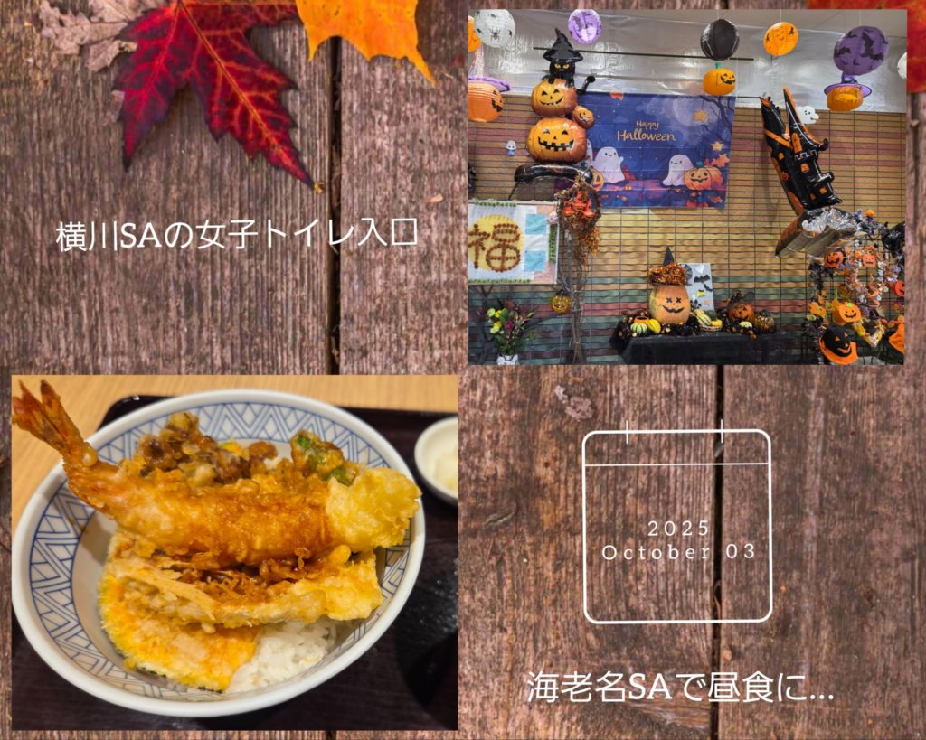さて、運転変わろうと思ったのですが、関越の高坂SAまで旦那さんが運転し、そこから横川SAまで運転したのですが、横川SAの女性用トイレの入り口がハロウィンモード全開でびっくりしましたよ(笑)