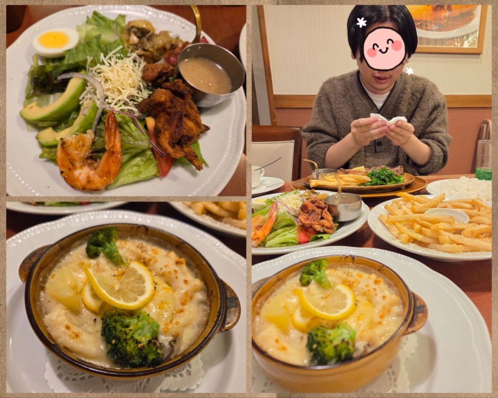 凄い量ですよ…。次男は250gのステーキ食べてました💦お互い昼抜きで頑張ったものね、と、調子に乗って私も食べちゃいましたが(牡蠣の檸檬クリームグラタン)w