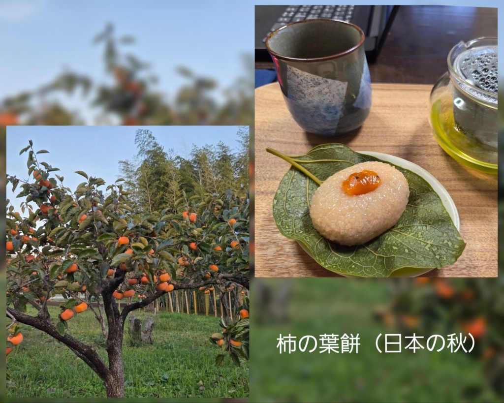 散歩の通り沿いにも柿木が沢山あって秋をしみじみと感じていましたが、この柿の葉餅は初めてでした。上品なあんこと道明寺粉でできていて、上にあしらった柿がとっても合っていてとても美味しかったです💕