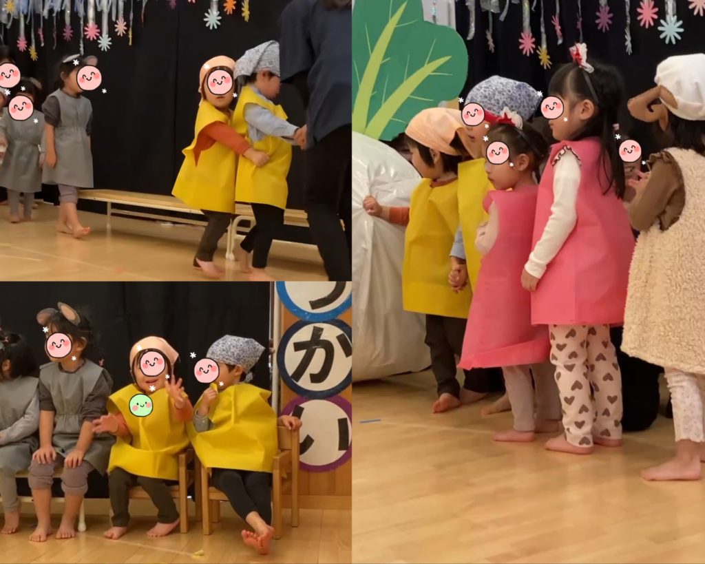 それでも、まだ緊張することも無く、上機嫌でかぶを引き抜いていいましたが、アドリブだったみたいですが、「ぜんぜん ぬけな~い」と叫んでは親御さんたちを笑わせていたようです。