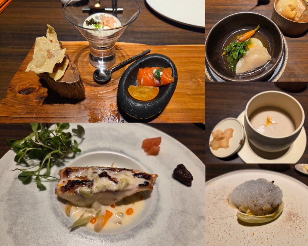 夜は席でいただくディナーでした。最初の料理は日光杉の一枚板に乗ってくるという演出もにくい。お祝いのシャンパンもサービスでついておりましたよ💕