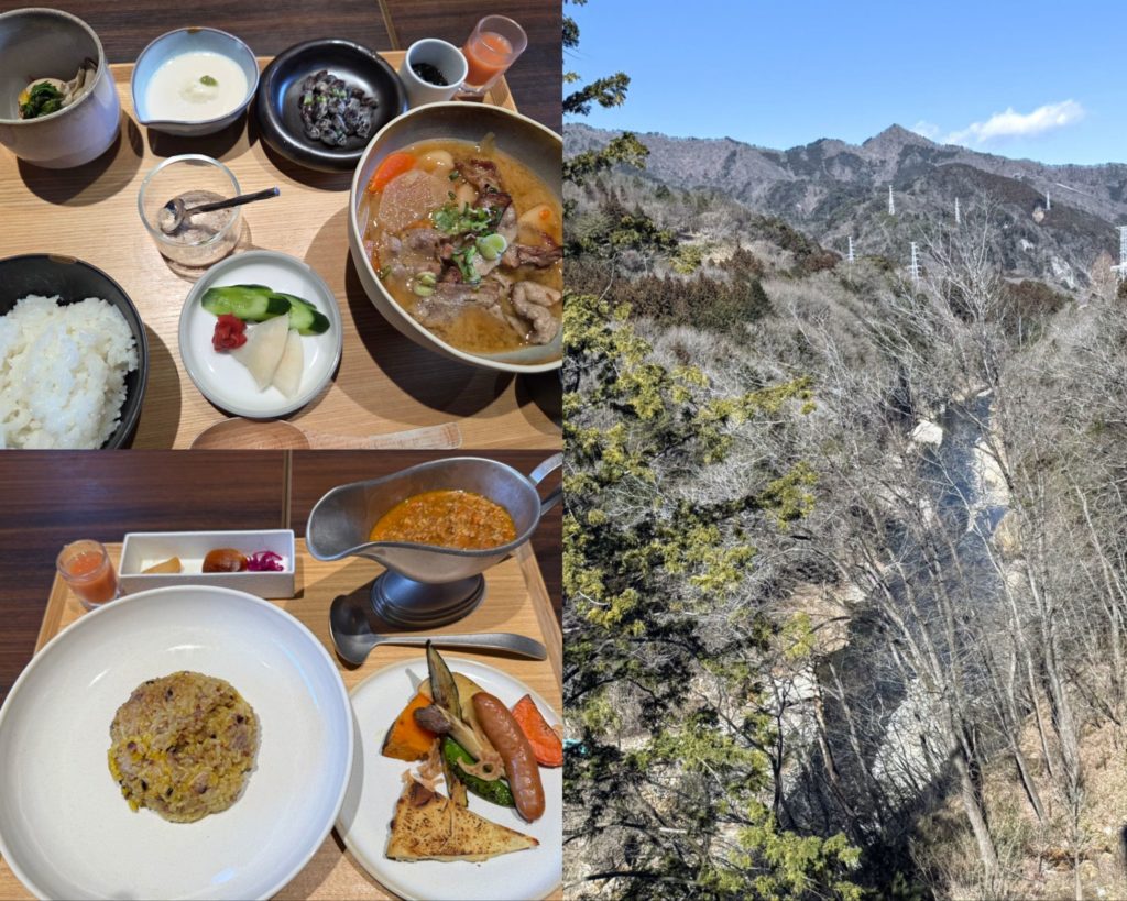 右側は鬼怒川、上が私が頼んだヒミツ(日光)豚の豚汁御膳、下が旦那さんの朝カレー御膳です。