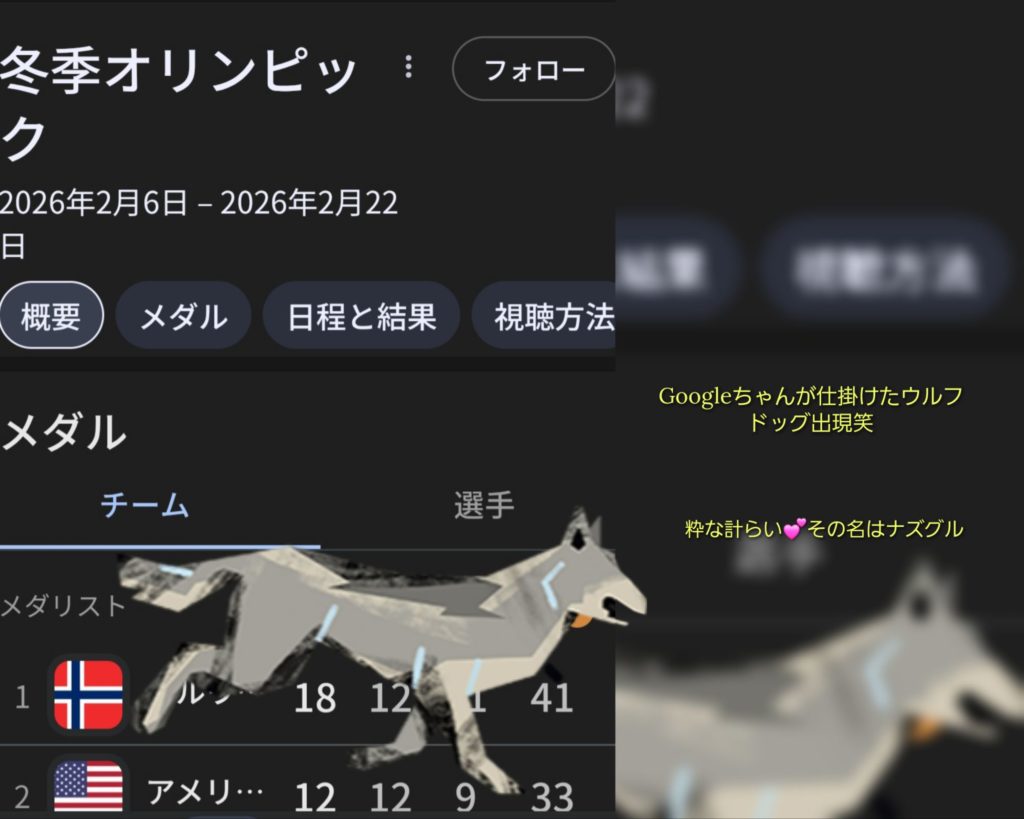 オリンピック入力で 感動と涙の嵐だった冬季オリンピックは閉会式も終わり(今回はリアルタイムは無理でした)、朝ニュースを見ていたら楽しい話題が。 何でもGoogle検索でオリンピックを入力するとウルフドックが現れるとか。このワンちゃん有名だったのですね。競技中に現れて一緒に走ったとかでw 早速やってみました!☆ 飼い主が探していたとかで、でも見つかって良かった(笑) 何でも名前が「ナグズル」とかで、ロード・オブ・ザ・リングフェチとしてはたまらない名でしたので取り合えず記念にアップです♬ By matiy38 | 2026-02-22 | 季節のイベント | ← TVショッピング 60周年イベント →